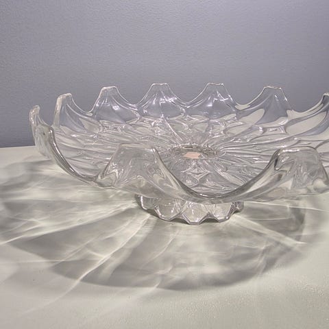 Elegant vintage sukkerskål (bonbonnière) i klart pressglass med klassisk geometrisk slip. Skålen har flott klarhet og fint lysspill, og leveres komplett med originalt lokk. Et tidløst serveringsstykke som fungerer like godt på kaffebordet som i vitrineskap.