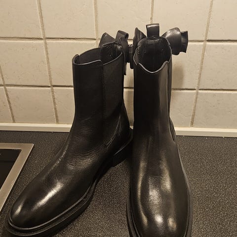 Vagabond støvler i størrelse 42. Klassiske ankelhøye støvler i svart skinn med elastiske sidepaneler og drahempe bak. Grov gummisåle gir godt grep. Passer til hverdagsbruk og kan kombineres med både jeans og penere antrekk.