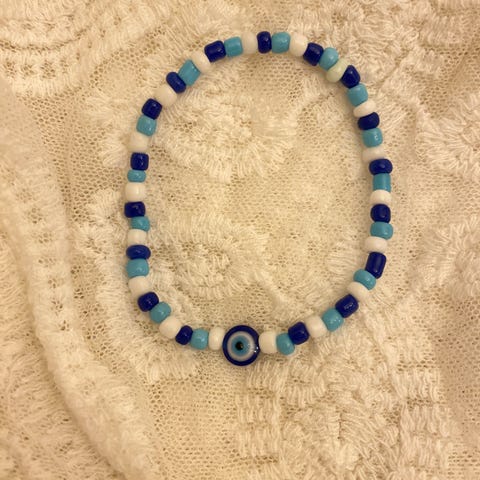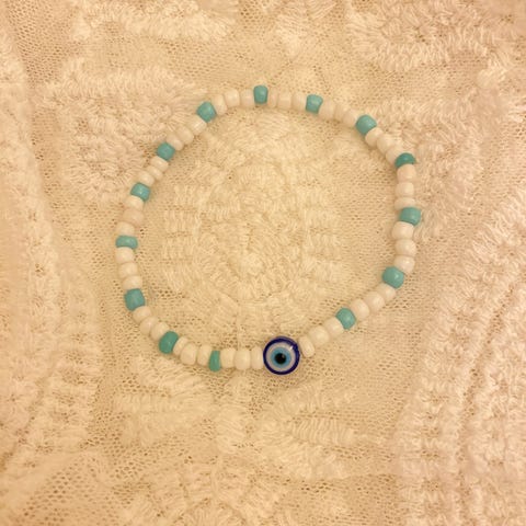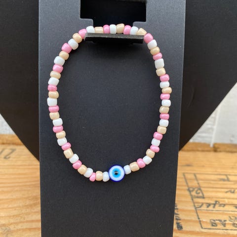 Pent armbånd med perler og evil eye-symbol, kjent for å symbolisere beskyttelse og positiv energi. Et lett og fint smykke som passer til både hverdag og sommerantrekk.