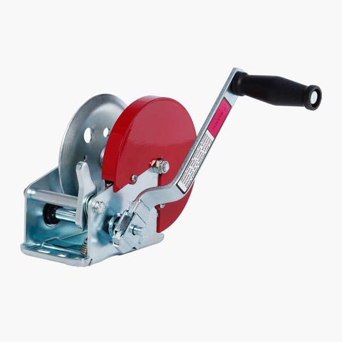 All Purpose Winch manuell vinsj med kapasitet på 2500 lbs / 1130 kg. Vinsjen har sveiv, tannhjulsmekanisme og krok med bånd for trekking og vinsjing av last. Egnet til for eksempel båthenger eller annen manuell trekking der det er behov for mekanisk vinsj med denne kapasiteten. Metallkonstruksjon med synlige bruksmerker og overflaterust.