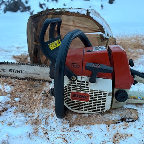 Stihl 038 AV MAGNUM motorsag. Bensindrevet sag med kjedebeskyttelse. Egnet til generelt skogs- og vedarbeid der det er behov for en kraftig motorsag.