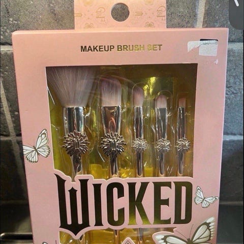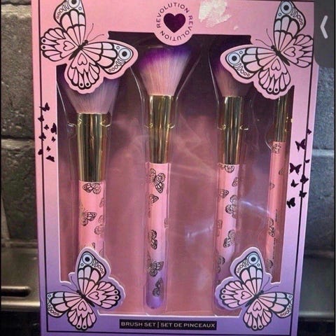 Sminkebørstesett bestående av to ulike sett med børster. Det ene settet har rosa håndtak med sommerfuglmotiv og gullfargede detaljer. Det andre settet har håndtak formet som havfruehaler i flerfargede metalliske nyanser. Børstene har myke syntetiske hår som egner seg til påføring og blending av sminke i ansiktet, for eksempel pudder, blush og bronzer. Passer til generell bruk av sminkeprodukter.