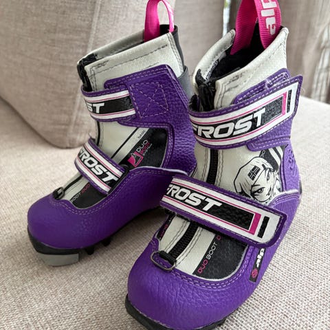 Frost langrennsstøvler for barn i størrelse 35. Modellen har overdel i syntetisk materiale med lilla og hvite detaljer. Støvlene har borrelåslukking over vristen for enkel justering og god passform. Sålen er tilpasset moderne langrennsbindinger (NNN-system). Egnet til bruk på ski for barn som trenger stabile og varme langrennsstøvler.