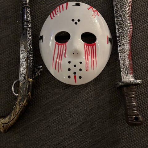 Kostymetilbehør bestående av et rødfarget plastkjede og en buet plastkniv med mørkt håndtak. Settet inkluderer også en liten pose med snor. Egnet som rekvisitt til utkledning, temafester eller lignende der man ønsker et dramatisk uttrykk. Laget i plastmateriale uten skarpe kanter, beregnet som leke- og kostymeutstyr.