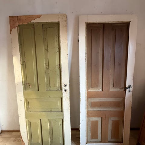 Innerdør i tre med håndtak og lås. Døren har slett overflate og klassisk trestruktur. Egnet som innvendig dør i bolig, for eksempel til soverom, bod eller andre rom der det er behov for en enkel tredør. Eventuelle mål og hengsling kan oppgis av selger ved behov.