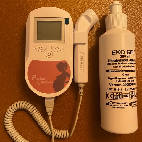 Pocket Fetal Doppler apparat i hvit plast. Håndholdt enhet for lytting til fosterlyd med separat prober og spiralformet kabel. Enheten har bakbelyst skjerm på fronten og høyttaler integrert i selve apparatet. Drives av AA batterier. Egnet for privat bruk til å lytte til fosterlyd i svangerskapet i hjemmemiljø, innenfor rammene av produsentens bruksanvisning og anbefalinger.