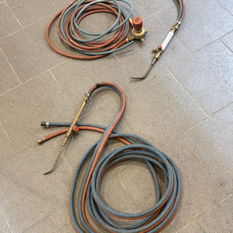 Skjære brenner med eie flakser, med div utstyr selges. Følger også med tilbakeslags ventiler også. Klar til bruk.