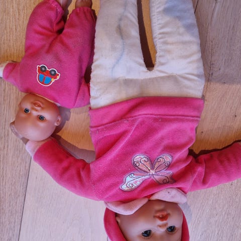 Baby Born dukker sett med tre babydokker i ulike størrelser. Dukkene har bevegelige armer og ben, og er kledd i rosa babyklær, blant annet body, pysjamas og lue. Settet inkluderer også en liten myk figur i rosa. Passer til rollelek og dukkestell for barn som liker babydokker og tilbehør.