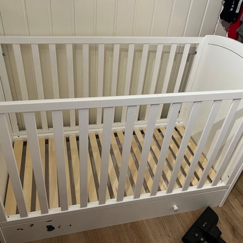 Sprinkelseng i hvit utførelse. Klassisk seng med sprosser på alle sider og tette gavler. Egnet for baby og småbarn. Sengen har rette ben og buede gavler som gir et tradisjonelt uttrykk.