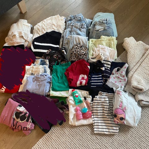 Klespakke til jente i str. 122/128 og 134/140. Størrelsene er brukt litt om hverandre.
