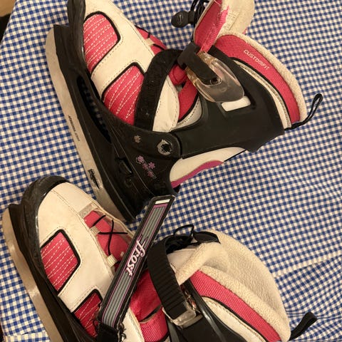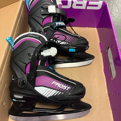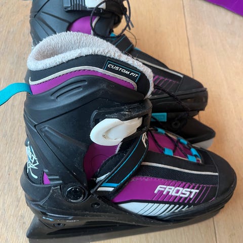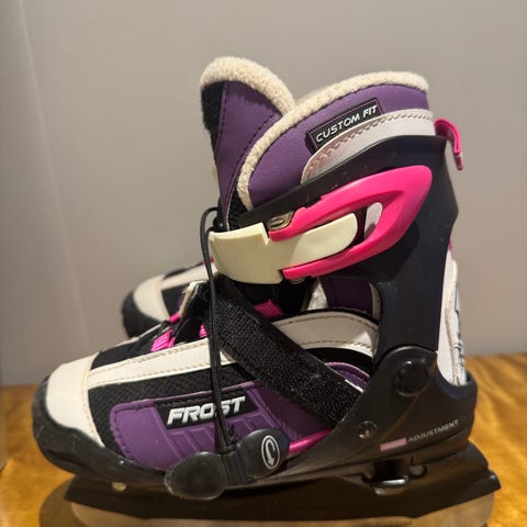 Frost Custom Fit skøyter for barn i justerbar størrelse fra 33-36. Skøytene har hard yttersko med justeringsmekanisme på siden og borrelås/spenne for enkel tilpasning. Fargekombinasjon i lilla, rosa, hvit og svart. Egnet til generell skøytebruk på is for barn. Illustrasjon på hælen og polstret innersko for bedre komfort.