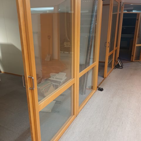 Glassvegger med ramme i tre, egnet for kontor eller rominndeling. Materialet er tre og glass, og veggene har en naturlig trefargje( tror det er lønn) Designet inkluderer skyvedører og faste glasspartier for å dele opp rom på en funksjonell måte. Det er mer moduler enn hva som fremkommer på bilder. De som skal ha mye blir prioritert.