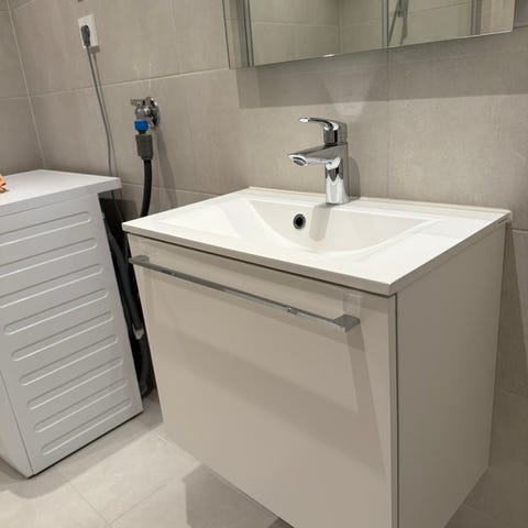 IKEA baderomsinnredning med servant. Ikke brukt. Nypris 8000.-Møbelet har bredde på ca. 100 cm, dybde på ca. 49 cm og høyde på ca. 64 cm. Innredningen består av servantskap med to skuffer og integrert servant på toppen. Farge: hvit. Passer til montering på vegg på bad, med plass til oppbevaring i skuffene under servanten. Blandebatteri og bunnventil er allerede montert. Må hentes.