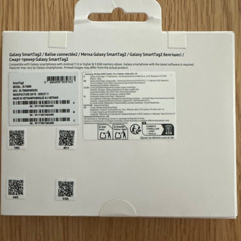 Samsung Galaxy SmartTag og Galaxy SmartTag2 sporingsbrikker. Settet på bildet viser en pakke med flere Galaxy SmartTag-enheter og én Galaxy SmartTag2-enhet. Sporingsbrikkene kan festes til nøkler, vesker eller andre eiendeler for å gjøre dem enklere å finne igjen ved hjelp av kompatibel Samsung-enhet og tilhørende app. Egnet for bruk i hverdagen der man ønsker oversikt over personlige eiendeler.