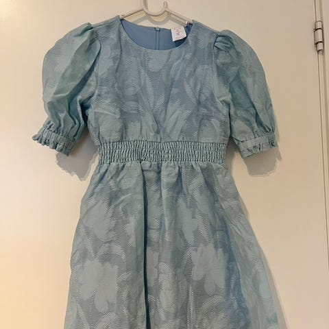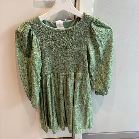 Ellos kjole for jente i størrelse 128. Kjolen er grønn med blomsterstruktur og er laget i polyester. Modellen har korte ermer, rund hals og utsvingt skjørtedel. Glidelås i ryggen for enkel av- og påkledning. Passer til både hverdagsbruk og enklere selskapelige anledninger.