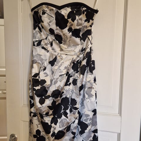 H&M festkjole sommerkjole dame i størrelse L. Kjolen er flerfarget med mønster og laget i polyester. Modellen er stroppeløs med langt, plissert skjørt. Passer til bruk på varme dager, ferie eller andre anledninger der en lett sommerkjole er ønsket.