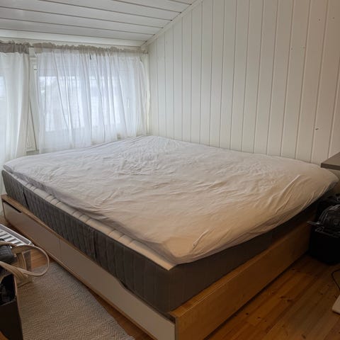 Dobbel rammemadrass. 2x80 cm rammemadrasser satt sammen til 160 cm. 200 cm lang. Overmadrass og mellomlegg til madrassene følger med. Sengetøy følger ikke med. Må hentes.