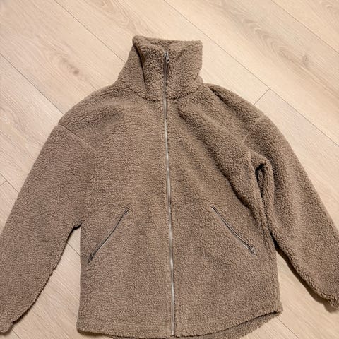 Teddyjakke i fargen kremhvit, str S selges da den ikke blir brukt - kun brukt 1 gang.. jakken har høy krage, glidelås i front og to sidelommer med glidelås.