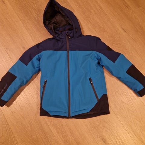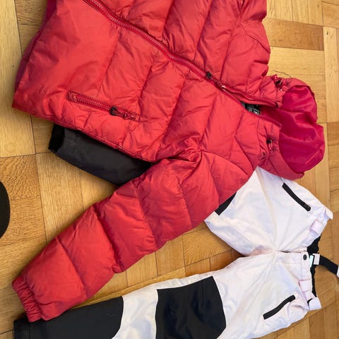 Ytterjakker, vindstopper, en regnjakke og skibukse i str 122-128. De var brukt av både gutt og jente her i huset. Pent brukte.