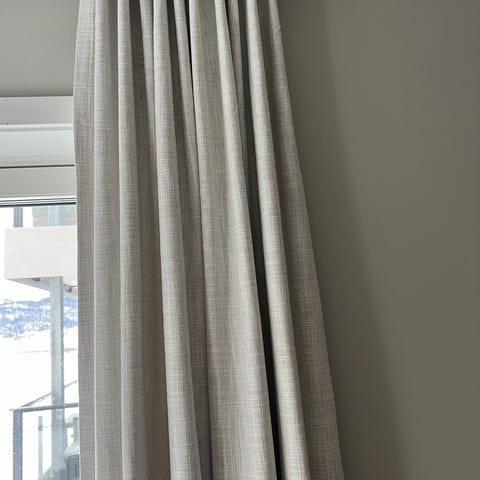 En gardin er uåpnet i pakken. Den andre er åpnet, men kun hengt opp for å prøve, og aldri brukt, da den viste seg å være akkurat litt kort.