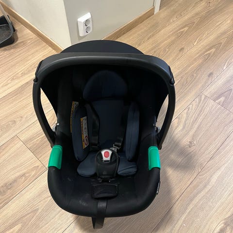 Bilsetet har polstret sete og hodestøtte med ekstra innlegg for spedbarn, samt integrert bærehåndtak. Trekket er i mørk/svart tekstil. Passer fra nyfødt og opp til ca. 13 kg, avhengig av barnets høyde og vekt.