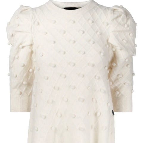 Genser i ullblanding med dekorative detaljer foran og puffermer. Genseren har runs hals og 3/4 lange ermer.