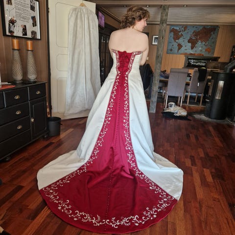 Selger en brudekjole. Det er knytting bak på kjolen så den passer de fleste fra en liten L til XXl.