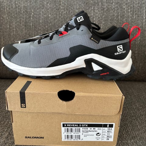 Salomon Alphacross Blast joggesko i størrelse 45 1/3. Modellen er en terrenginspirert joggesko med grov yttersåle for godt grep på variert underlag. Skoen har overdel i syntetisk materiale og tekstil, med snøring for justerbar passform. Fargekombinasjon svart/hvit med kontrastdetaljer. Egnet til løping og tur på sti og grus, samt til hverdagsbruk der det er behov for en stabil og komfortabel joggesko.