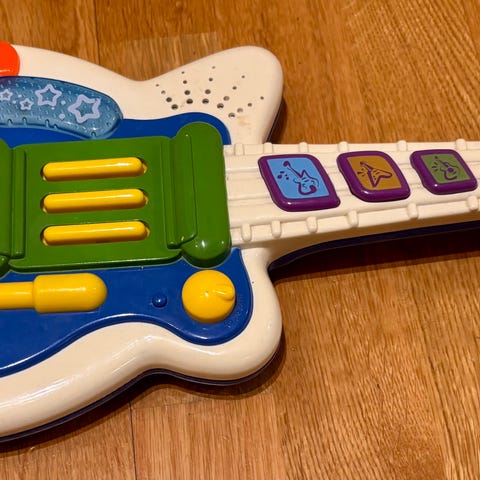 Fisher-Price leketøysgitar i plast i flere farger. Liten, håndholdt gitar utformet for små barn, med knapper som kan trykkes på. Formen og størrelsen gjør den egnet for barnehender, og den kan brukes som enkel musikkeleke i lek og aktivitet for barn.