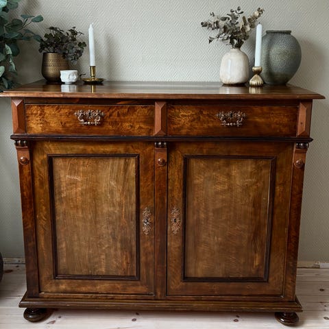 flammebjørk, masurbjørk, senempire, biedermeier kommode, 1800-talls kommode, skandinavisk antikk, retro møbel, klassisk møbel, entremøbel, skjenk, skap, pidestall, lintøyskap, herskapelig, cottagecore, nordic farmhouse, håndlaget møbel, chateau stil, bondemøbel, vintage, fransk landstil, patina