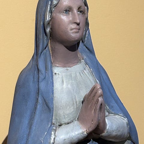 i form av et hode montert på rektangulær sokkel. Figuren er utskåret i tre med synlige utskjæringsdetaljer og har et rolig, stilisert ansikt. Passer som dekorativ gjenstand på bord, hylle eller kommode i stue, gang eller kontor.