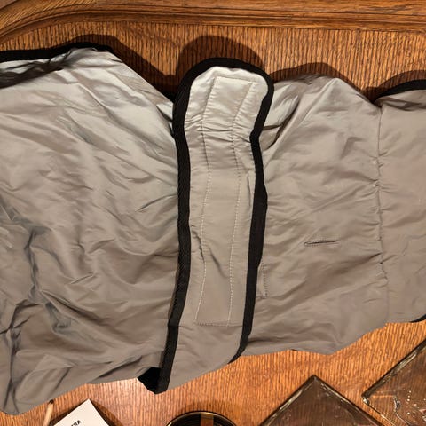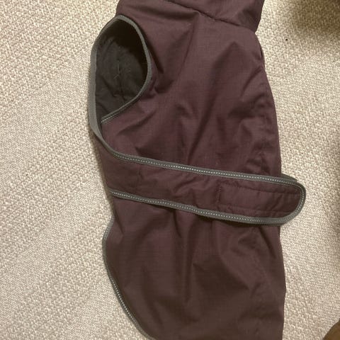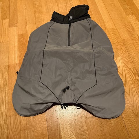 Hooks hundedekken i størrelse 40 cm. Dekkenet er grått på utsiden med mørk innside. Det har åpninger til forben og lukkes foran. Passer til mindre hunder med rygglengde rundt 40 cm. Egnet som beskyttelse mot vær og vind på tur og i hverdagsbruk.