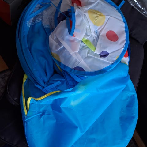Stor ballbinge med to sekker med baller. Ballene er av ulike størrelse og farge.