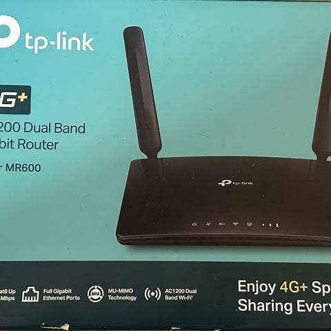 Trådløs ruter med Wi-Fi 6 (AX5400) som støtter både 2,4 GHz og 5 GHz-bånd. Enheten har flere eksterne antenner for bedre dekning og stabilitet. På baksiden finnes én WAN-port og flere LAN-porter for kablet tilkobling av nettverksenheter. Strømadapter følger med, som vist på bildene.
