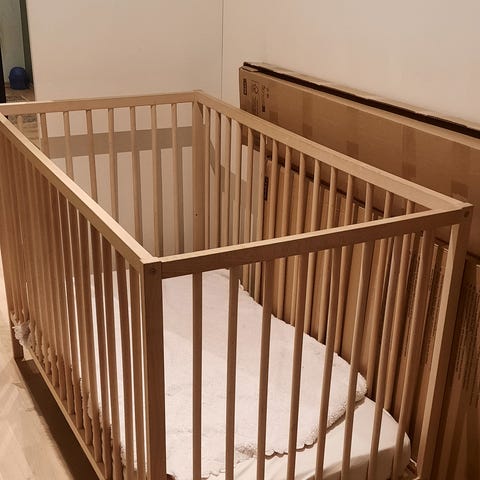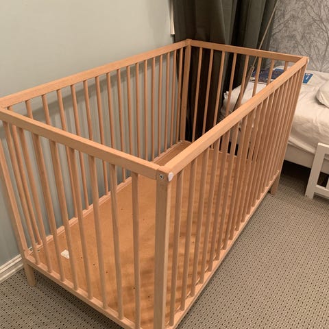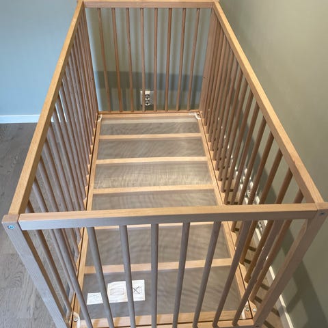 IKEA sprinkelseng i tre. Enkelte bruksmerker, men har ingenting å si for bruken. Justerbar bunn. Pent brukt madrass kan følge med om ønskelig. Da blir totalpris 400kr.
