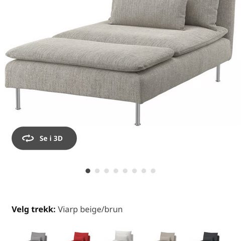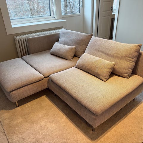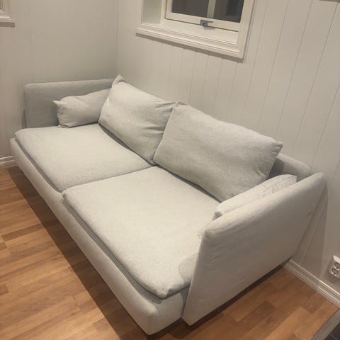 Selger toseter IKEA Søderhamn med eikeben. Står uten armlene på venstre side, men føler med medfølgende armlene og skruer som man kan montere om man ønsker dette. Det er foreløpig ikke laget hull i stoffet til dette, slik at den fremdeles er pen på siden om man skulle ønske å ha «open end». Må hentes, kan være behjelpelig med bæring.