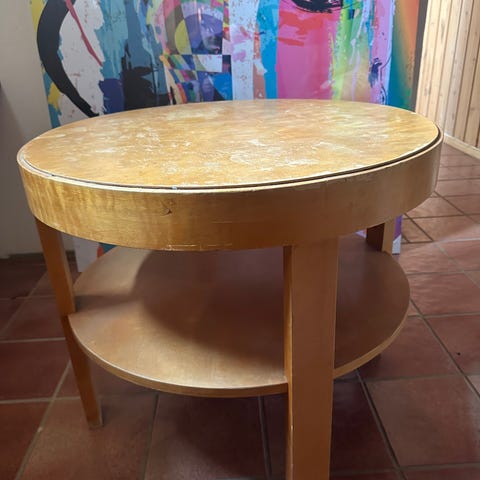 Skikkelig kult rundt retro bord, med hylle under. Norsk, se klistremerke. Trolig fra 70tallet.