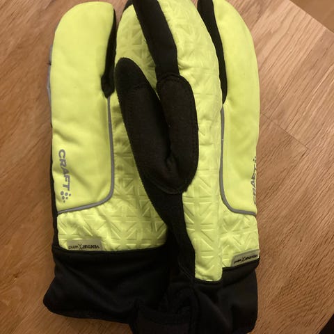 Craft hansker i størrelse S. Hanskene er svarte og har forsterkede partier i håndflaten samt grepdetaljer. De har lengre mansjett med strikk for bedre passform rundt håndleddet. Egnet til bruk i kaldere vær, for eksempel til sykling, løping eller annen utendørsaktivitet.
