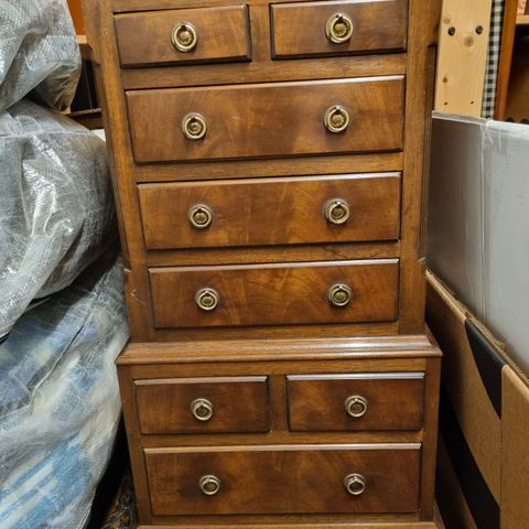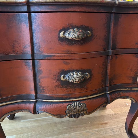 Pen og solid kommode i klassisk rokokko stil/Louis XU stil. Trolig fra første halvdel av 1900 tallet. Kommoden har runde former, vakker finer/mahogny-valnøtt, og orginale messing beslag. Mangler nøkler. Skuffene er pene innvendig. Noen flekker i øverste skuff innvendig. Ellers et pent og tidløst uttrykk. Overflaten har normal brukspatina, og ingen store skader. Står stødig.