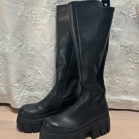 NA-KD støvler i størrelse 36. Høye støvletter i fin mørkegrønn farge med chunky såle. Glidelås på innsiden støvlettene. Overdel i glatt materiale med rund tå. Egnet som hverdagsstøvler i kjøligere vær.