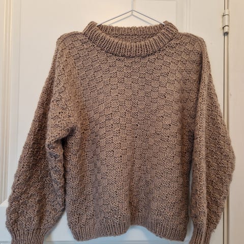 NA-KD genser str S. Genseren er beige, 100 % akryl, rund hals, lange ermer og et parti med hullstrikk nederst på bolen både foran og bak.