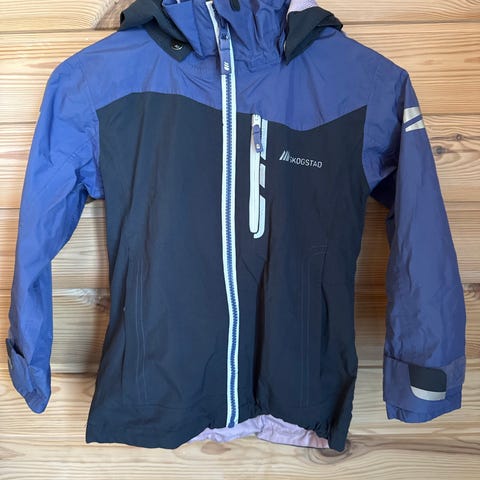 Har avtagbar hette. Jakka er blå med refleks. Den er vind og vann avvisende.