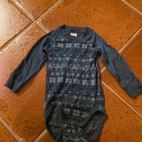 Polarn O. Pyret ullbody i størrelse 74/80 for unisex barn. Bodyen er laget av ull og har lang erm. Fargen er blå med mønster.
