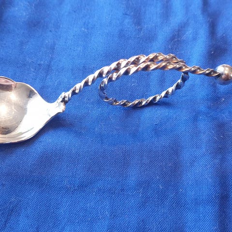 Vintage fest sølv sukkerskje .12cm.Vridd skaft ,bladmønster på undersiden .