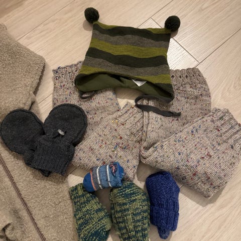 Ullpakke med bruksklær til barn. Str 74, noen plagg i 80/86 men som oppleves som stor 74.