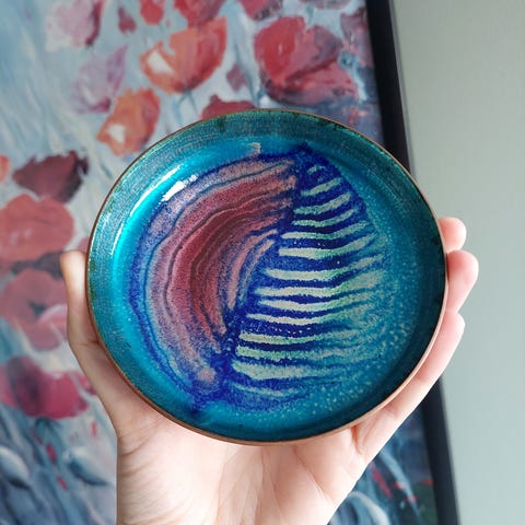 Vintage lite fat/skål i kobber med emalje dekor ✨️ Er signert KB. Veldig pent unikt håndlaget norsk smykkefat / smykkeskål ✨️