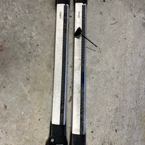Thule Wingbar lasteholder med to aluminiumsbøyler i sølv med svarte endestykker. Bøylene har integrert spor for feste av ulike takstativtilbehør. 2 stk nøkler samt monteringsverktøy medfølger. Wingbaren har stått på Volvo XC60 T8 og BMW 520 stasjonsvogn. Mulig den passer til andre biler også.