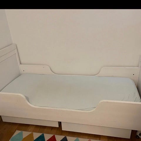 Madrassen er godt brukt, men er utrolig god og har mange årsbruk igjen. Sengen trenger overmadrass, men da ligger du som en konge. Rammen er skiftet ut til en mindre klumpete utgave