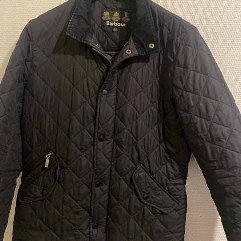 Barbour vattert jakke i svart, quiltet mønster. Jakken har krage i kontrastmateriale, knappelukking foran og lengde ned mot midten av låret. Størrelse M. Passer som lett ytterjakke i overgangssesonger. Laget i syntetisk, vattert materiale med innvendig lomme med glidelås.