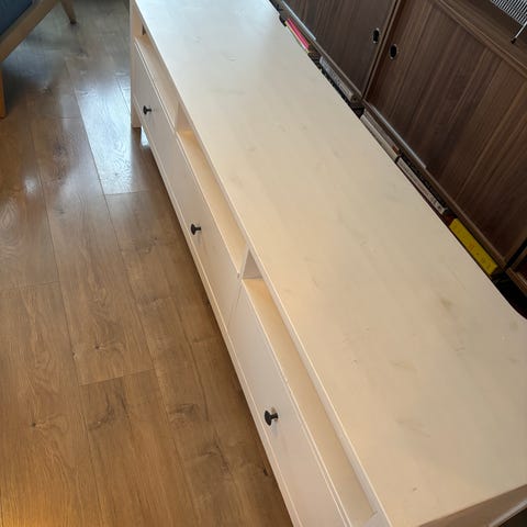 Selger en hemnes tv benk. Den er malt helhvit og bærer preg av å ha blitt brukt. Er en del småmerker men med et malingsstrøk vil den være så god som ny. Ellers fungerer skuffer og slikt som det skal 😊
